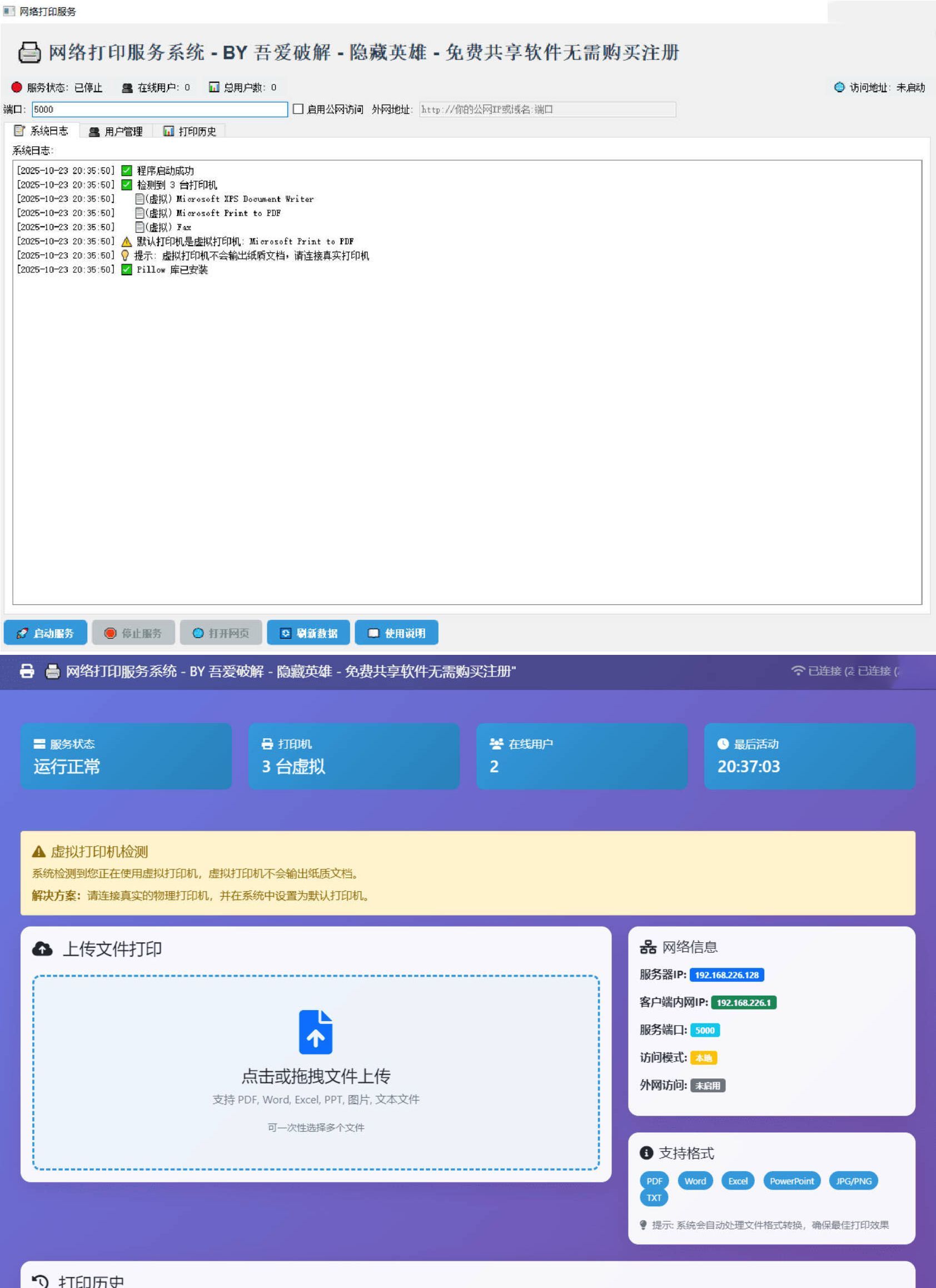 一个基于 PyQt5 和 Flask 的网络打印服务系统,支持多用户通过网络上传和打印文档、图片等文件。适用于小型办公场所,不限打印机型号,只要打印机连着服务器,服务器上安装好打印机驱动即可!!!